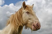 Een Tinker Portret in zeldzame kleur Cremello op een weiland in Oost-Friesland