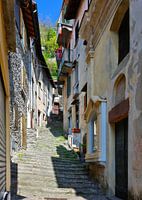 Eine Gasse mit vielen Stufen führt hinauf zu den oben gelegenen Wohnhäusern: Maccagno Superiore, ein Dorf am Lago Maggiore. Italien, Lombardei, Varese. Frühling 1017.