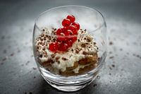 Een foto van tiramisu met aalbessen op een mooie zwarte leisteen