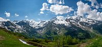 Uitzicht in de Fuscher vallei in de richting van de Fuscherkarkopfs en de Hohe Dock berg en Fuscher Törl bergpas in de provincie Salzburg, Oostenrijk tijdens een mooie lentedag.