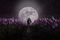 Surrealistisch beeld van een liefdeskoppel bij maanlicht in een tulpenveld.