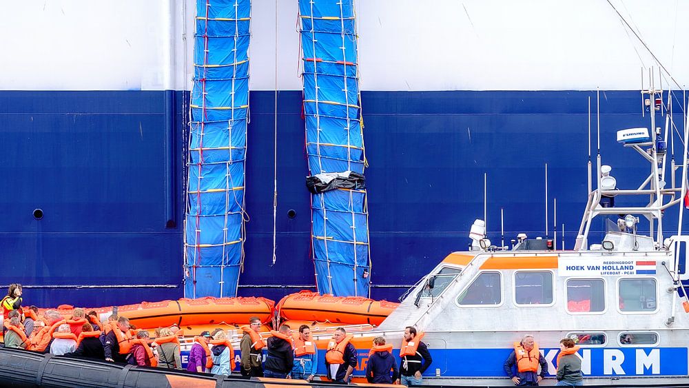 Reddingboot van de KNRM evacueert reddingvlotten tijdens een grote oefening.