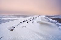 Oude dijk bedekt met sneeuw op bevroren Ijsselmeer, Nederland