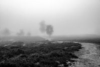 Mystiek landschap op de Hollandse heide. Mist en het kronkelende pad beelden de te nemen weg en de onzekerheid uit.