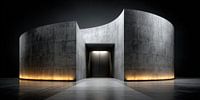 Deze afbeelding toont een monumentale, minimalistische structuur van ruw beton, waarvan de heldere vormen en zachte rondingen een kalm, bijna heilig effect creëren. Twee solide, licht gebogen muurelementen omlijsten een centrale ingang die het oog doelbewust de diepte in stuurt. De architectuur lijkt tegelijkertijd gesloten en…