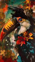 De achtergrond is een abstracte mengeling van kleuren en vormen, met spatten van rood en groen die een sfeer van een tropisch regenwoud oproepen. De bloemen die de toekan flankeren, lijken bijna te fuseren met het dier, wat de vermenging van fauna en flora benadrukt. Dit samenspel van elementen geeft het kunstwerk een dynamisch en bijna overweldigend gevoel.