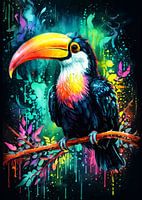 Een levendig aquarelschilderij van een toekan tegen een donkere achtergrond, waarop de vogel's kleurrijke snavel en verenkleed in opvallende neontinten te zien zijn. Het contrast tussen de felle kleuren en de diepe achtergrond creëert een boeiend en levendig visueel effect en benadrukt de exotische schoonheid en speelse aard van de toekan's.