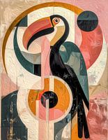 Figuratief en modern kunstwerk van een toekan. Opgezet met geometrische vormen in oranje, blauw, grijs beige en zwart.