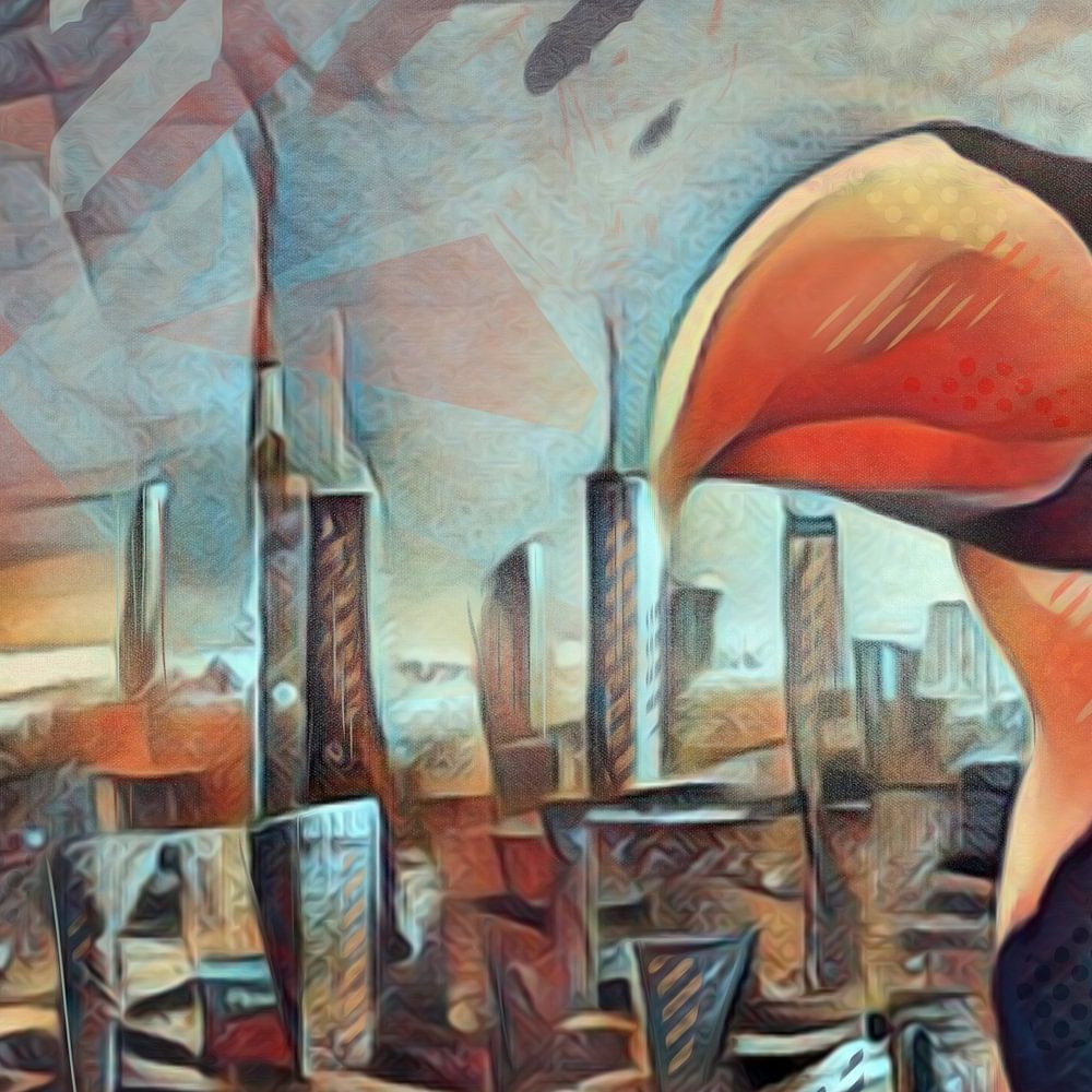 Digitaal artwork in mixed media stijl. Deels AI deels getekend een photoshop. Kleurig kunstwerk van een toekan die over de stad uitkijkt vanaf een flatgebouw.