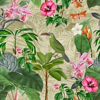 tropisch junglelandschap met exotische toekans, kleurrijke bloemen en weelderige groene vegetatie