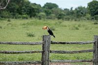 Mooie toekan zit met open snavel op een houten hek bij een weiland in de Braziliaanse Pantanal aan het begin van het regenseizoen.