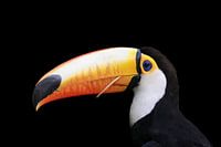 Een mooie toekan met zijn fel oranje gekleurde snavel met een strootje, gele en witte vlakken en een fel blauwe oogring tegen een zwarte achtergrond.