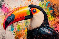 Een majestueuze toekan schittert in levendige kleurschakeringen, zijn indrukwekkende snavel gloeit in een regenboog van tinten. Het zwarte lichaam vormt een krachtig contrast met de cirkelende kleurspatten op de achtergrond, die de foto onderdompelen in een levendige, tropische sfeer. De ogen sprankelen van nieuwsgierigheid en levensvreugde, alsof ze verhalen uit de jungle kunnen vertellen.