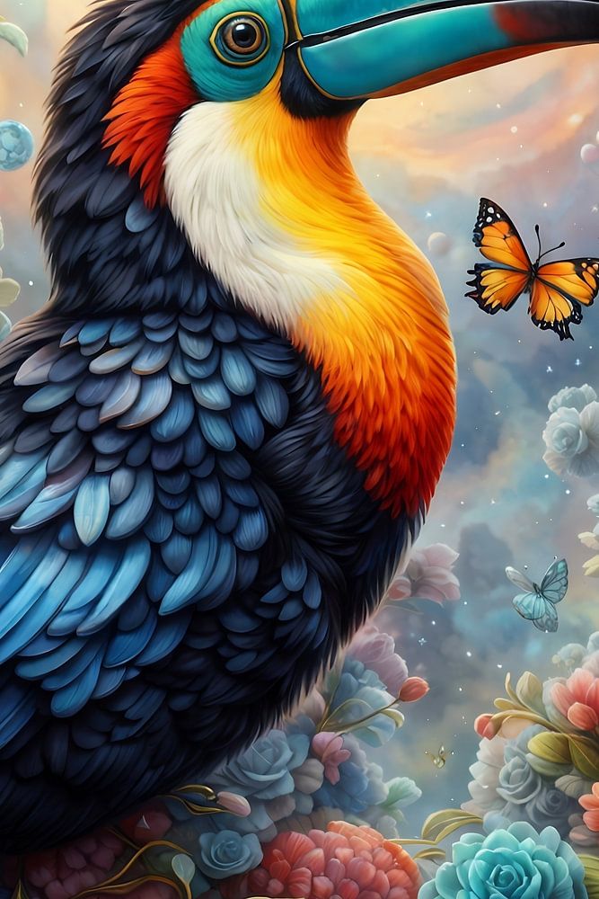 Vlinders vliegen in de lucht. Kleine parels versieren de afbeelding en maken er een artistiek hoogtepunt van. Het tafereel straalt vitaliteit, dynamiek en tropische schoonheid uit, terwijl de toekan fungeert als een levend symbool van exotisme en leven in de jungle.