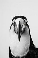Dit indrukwekkende zwart-wit portret van een toekan geeft de majestueuze elegantie en exotische schoonheid van de vogel perfect weer. De gedetailleerde weergave van de kenmerkende snavel en de duidelijke contrasten van de veren geven de afbeelding een speciale diepte en uitstraling. Dit kunstwerk is ideaal voor liefhebbers van exotische dieren en artistieke fotografie en geeft een indrukwekkend en stijlvol tintje aan je woon- of werkruimte.