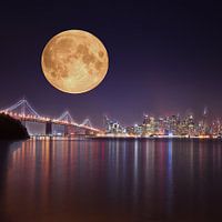 Een stad in de toekomst schittert met haar kleurrijke lichten tegen de uitpuilende, enorme volle maan.