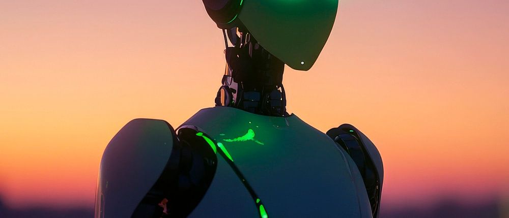 Te midden van een adembenemende zonsondergang schittert een futuristische figuur met heldergroene ogen en een elegant ontwerp. De combinatie van menselijke trekken en technologische flair creëert een fascinerende uitstraling. Dit kunstwerk, ideaal voor in de woonkamer, trekt ieders aandacht en stimuleert interessante gesprekken.