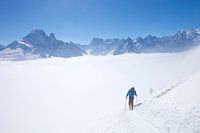 Een toerskiër op weg in een witte wereld. Op de achtergrond de spitse bergpunten van Chamonix met onder meer de Aiguille Verte, Les Drus, Grandes Jorasses, Aiguille du Midi en Mont Blanc du Tacul.
