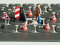 Minituur arbeiders hebben de letter "G" uit het toetsenbord gehaal;d om eronder schoon te kunnen maken. Voor de zekerheid is het werkgebied goed afgezet met pionnen. Deze kleine figuurtjes zijn ongeveer twee centimeter hoog en worden vaak gebruikt in de modelbouw of bij modelspoorbanen. De poppetjes zijn op schaal 1:87 en dus ook prima te gebruiken in de fotografie. Het levert een vaak grappig of vervreemdend beeld op. Deze vorm van fotografie valt on de macrofotografie, maar wordt ook vaak aangeduid met miniatuur fotografie.