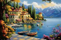 Het schilderij toont een schilderachtig Italiaans merenlandschap waarin de uitlopers van de Alpen harmonieus samengaan met het glinsterende water van een kalm meer. Op de voorgrond verrijst een elegante villa waarvan de terracottakleurige gevel oplicht in het warme licht van de middagzon. De grote ramen weerspiegelen de kleuren van de lucht en het water, terwijl bloeiende bougainville en geurige cipressen de tuin omlijsten en een gevoel van mediterrane idylle uitstralen.