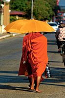 Onder de felle Cambodjaanse zon lopen twee boeddhistische monniken vredig blootsvoets over een stoffige weg. Van achteren steken hun oranje gedrapeerde silhouetten af tegen hun omgeving, terwijl elk van hen een paraplu vasthoudt die bij hun outfit past en hen beschermt tegen de zinderende hitte. Ze lopen kalm en meditatief, symbool voor…