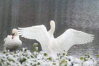 Op dit werk zie je twee zwanen aan de rand van het water. Eén staat stil, de ander spreidt zijn vleugels open, niet om weg te vliegen maar om ruimte in te nemen. De beweging voelt gecontroleerd en voorzichtig, bijna aftastend. Het water erachter is rustig en egaal, waardoor de witte vormen extra loskomen van hun omgeving. In de…