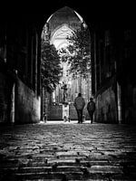 Twee mensen lopen onder de Dom in Utrecht door. Doordat een kunsternaar een impressie van de binnenzijde aan de buitenmuur van de kathedraal heeft laten hangen is het net of deze mensen binnen lopen. De Dom van Utrecht is een markante gotische kerk in het midden van de Nederlandse stad Utrecht. De kerk werd vanaf 1254 gebouwd als de kathedraal van het rooms-katholieke bisdom Utrecht en was gewijd aan Sint-Maarten. Sinds 1580 is de kerk protestants. De 112,32 meter hoge Domtoren is de hoogste kerktoren van Nederland en het hoogste gebouw van Utrecht.