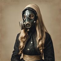 Een historisch vrouwelijk figuur in een Victoriaanse jurk. Haar gezicht is verborgen achter een gasmasker, waardoor ze een vreemde mix van elegantie en sinisterheid uitstraalt. De zachte bruine tinten versterken de nostalgie en het gevoel van een verloren tijd.