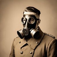 Een historisch mannelijk figuur in sepia in een militair uniform uit de vroege 20e eeuw. Zijn gezicht wordt verborgen door een gasmasker, wat een onheilspellende en geheimzinnige uitstraling geeft. De achtergrond is in sepia. De zachte bruine tinten versterken de melancholische sfeer van een vergeten tijdperk.