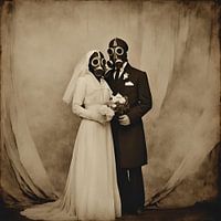 Een historisch bruidspaar in sepia toont een vrouw in een sierlijke, kanten trouwjurk met een lange sluier en een man in een elegant zwart trouwpak met een strikje. Beiden dragen gasmaskers, die een grimmige en onwerkelijke sfeer creëren te midden van hun formele kledij. De achtergrond is vervaagd sepia. Het contrast tussen hun…