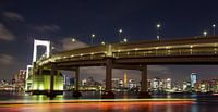 Tokio Rainbow Brug over de baai in Tokio met verlichting en reflectie in het water en lichtstrepen van passerende boten met een donkere lucht.