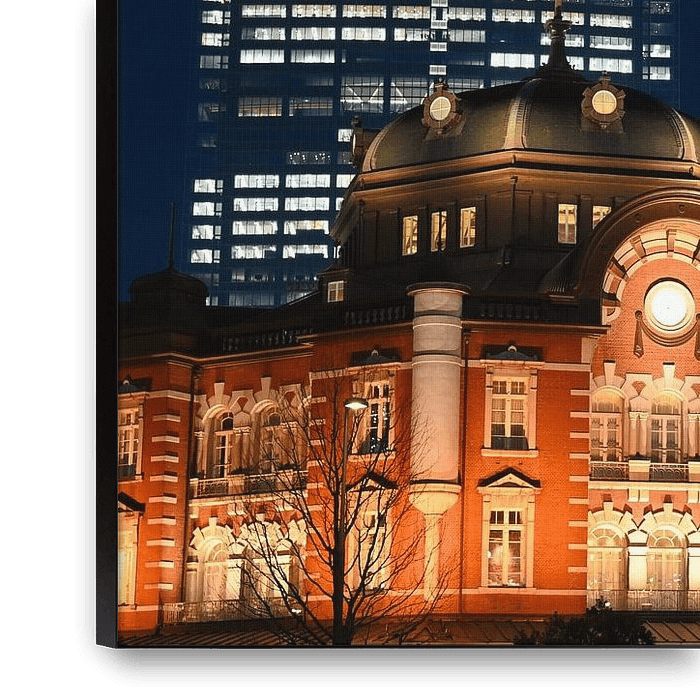 Een nachtelijk uitzicht op het historische rode bakstenen gebouw van Tokio Station, verlicht in warme tinten, in contrast met de slanke glazen wolkenkrabbers van de zakenwijk Marunouchi.