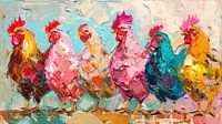 De hanen staan trots en zelfverzekerd, hun kleurrijke verenpracht in dik aangebrachte verf creëert een rijke textuur die bijna van het doek af lijkt te springen. Het palet varieert van diep rood en oranje tot helder blauw, roze en geel, wat elk dier een uniek karakter geeft. De achtergrond, geschilderd in rustige blauwe en crèmekleurige tinten, vormt een zachte tegenstelling met de felle kleuren van de hanen. Deze compositie straalt energie en levendigheid uit en is een viering van kleur en beweging.