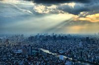 Zonsondergang boven Tokyo, prachtig uitzicht over de stad gezien van grote hoogte. De zonnestralen beschijnen door de wolken een deel van de immens grote stad Tokio. 's Avonds bij zonsondergang gefotografeerd vanuit de Tokyo Tower, op 365m. hoogte.