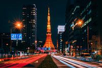 Een drukke straat die uitkijkt op de Tokyo Tower. Het ontwerp van de toren werd gebaseerd op de Eiffeltoren in Parijs, Frankrijk. Met zijn 333 meter droeg het, tot 29 maart 2010, de titel van hoogste bouwwerk in Japan.