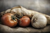 Dit werk toont een sfeervol stilleven van tomaten en een ui, waarbij de rustige kleuren en subtiele details een tijdloze uitstraling creëren. De zorgvuldig gekozen compositie benadrukt de ronde vormen van de tomaten en de gelaagde textuur van de ui, terwijl het zachte licht een serene en harmonieuze sfeer oproept.