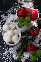 Heerlijke gezonde maaltijd. Tomaten, basilicum en verse mozzarella, prachtig keukenstilleven voor een decoratief huis.