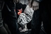 Een dakloze vrouw in Sham Shui Po, Hong Kong die een sigaret vindt op straat.