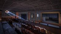 Deze foto toont het interieur van een verlaten theater, vastgelegd in een urbex-stijl (urban exploration). Hier zijn enkele opvallende kenmerken: