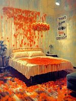 Dit kleurrijke en moderne kunstwerk kenmerkt zich door expressieve vormen en gedurfde kleurcontrasten en beeltenis. het glamoureuze bed met zijden lakens lijkt besmuikt door druipende oranje verf wat het werk gedurfd en uitdagend maakt die emoties oproepen, variërend van lust tot levendigheid. Met een palet van heldere oranje tinten…