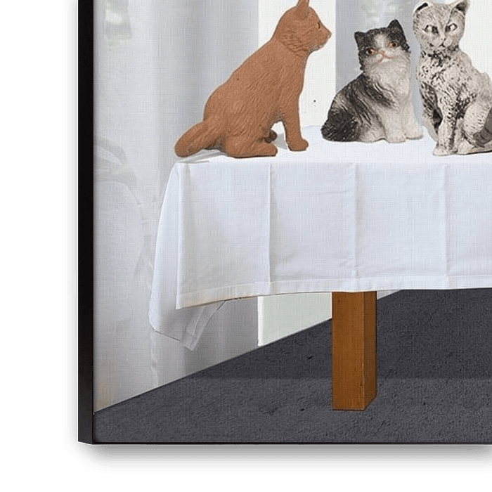 Een collage naar Het laatste avondmaal van Leonardo da Vinci met miniatuurkatten van Tonke Dragt, een aquarel van Erna Sievers en interieuronderdelen van Arend Jan Bolhuis.