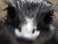 close-up. Nandoe (struisvogelsoort) neemt een nieuwsgierig kijkje in de cameralens. En wel heel letterlijk, want hij tikte bijna met z'n snavel tegen het glas van mijn lens. Ik vermoed dat de snavel zou hebben gewonnen.