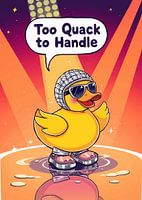 Een cartoonplaatje toont een gele eend met een zilveren helm en zonnebril. De eend draagt ook roze en zilveren schoenen. Boven de eend staat een tekstballon met de tekst "Too Quack to Handle". De achtergrond is een kleurverloop van oranje en paars met spotlights en sterren. De eend staat op een reflecterend oppervlak en laat…