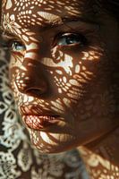 In dit fascinerende portret van een vrouw wordt haar gezicht kunstig geaccentueerd door een delicaat spel van kanten schaduwen. De delicate patronen liggen zachtjes op haar huid en geven het beeld een mysterieuze en esthetische diepte. Perfect voor liefhebbers van gedetailleerde en artistieke fotografie die de schoonheid in het…