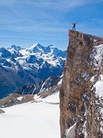 Een alpinist staat blij op de top van een berg in de buurt van Zermatt in Wallis, Zwitserland. De afgrond is steil, het uitzicht op onder andere de Dom, de hoogste berg van de Zwitserse Alpen, is prachtig.