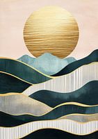Dit abstracte landschap is geïnspireerd op Japanse schilderkunst en toont indrukwekkende bergen en de mystieke uitstraling van de zon of de maan. Een beeld vol harmonie en kracht.