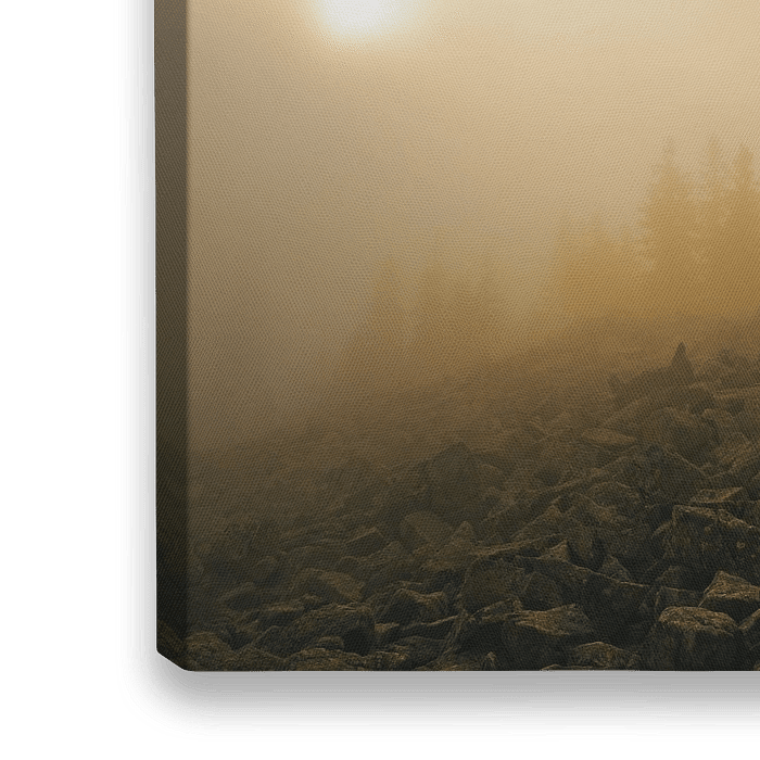 De foto is 's ochtends vroeg na zonsopgang genomen op de top van de Lusen in het Beierse Woud. Voor een kort, magisch moment brak de zon door de dichte mist voordat deze alles weer bedekte en het uitzicht versperde. De met mos bedekte rotsblokken die kenmerkend zijn voor de Lusen gloeien in het zachte, gouden licht van de ochtendzon,…