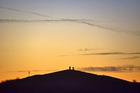 Mensen op de Rungenbergse slakkenberg in Gelsenkirchen bij de twee lichte kanonnen in de schemering