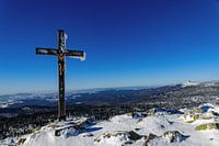 In de winter bij het topkruis op de Lusen in het Nationaal Park Beierse Woud in Beieren, Duitsland.