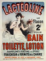 19e eeuwse advertentie poster van een topless zeemeermin of meermin, naakt die zeep aanprijst voor in bad. De meid is bloot en heeft een spons vast, waarbij haar buik, torso, borsten, schouders en armen zichtbaar zijn.